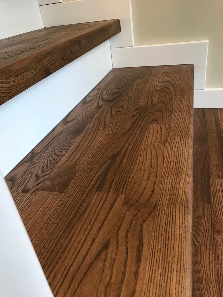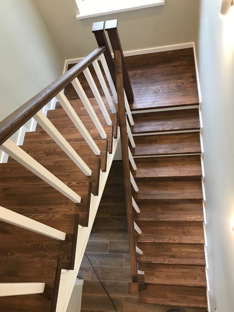 Самый распространенный материал - сосна, при этом ступени покрыты толстым шпоном ясеня. Также мы изготавливаем лестницы из лиственницы, бука, дуба, ясеня.